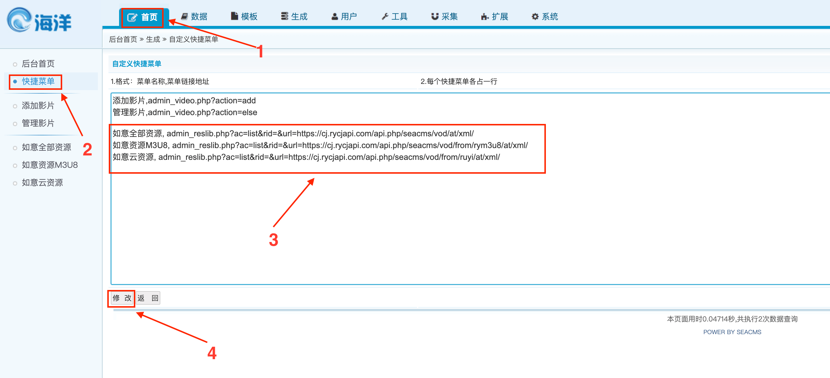 之后请按以下步骤进行:依次点击【首页】-【快捷菜单】,然后增加一行如意资源站,admin_okzy.asp