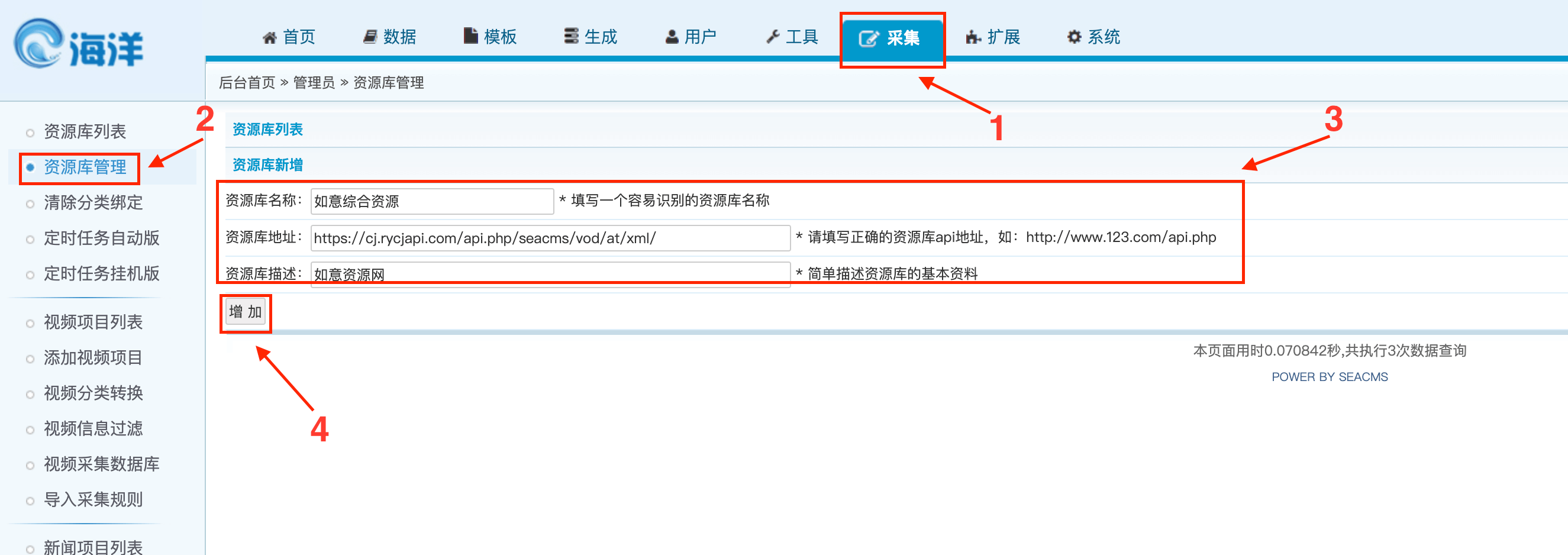 请按以下步骤进行:依次点击【采集】-【添加资源库】,然后依次输入
